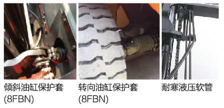 液壓系統(tǒng)的油泵、油缸類和閥類(轉向-制動)都采用低溫包裝,同時液壓軟管采用耐低溫的橡膠材質,有效防止低溫導致的軟管劣化和液壓功能異常 |
