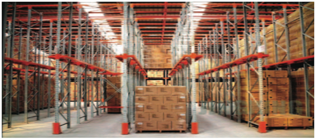 針對有限空間里同類貨物堆垛,推薦使用內(nèi)部駛?cè)胧截浖堋K蓭椭鷾p少占用通道,充分利用空間。駕駛員可駕駛叉車進入貨架內(nèi)部進行堆垛作業(yè)。不但能有效利用整個貨架的存儲空間,且初期投資成本較低。作為較為經(jīng)濟的批量存儲方式之一,駛?cè)胧截浖苓m用于存儲單位較少,周轉(zhuǎn)率較低的倉庫